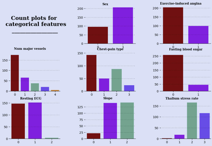 The categorical columns are: 'sex', 'exercise-induced-angina', 'num-major-vessels', 'chest-pain-type', 'fasting-blood-sugar', 'resting-ecg', 'slope', 'thal-rate'