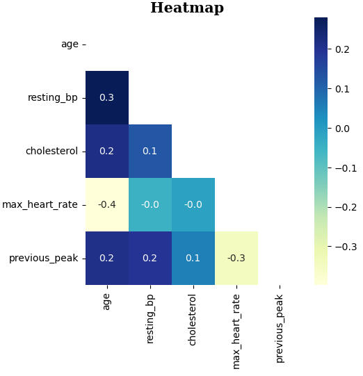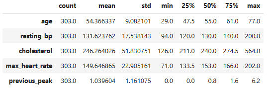 The continuous columns are: 'age', 'resting-bp', 'cholesterol', 'max-heart-rate', 'previous-peak'