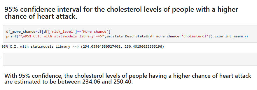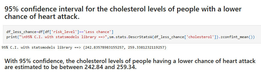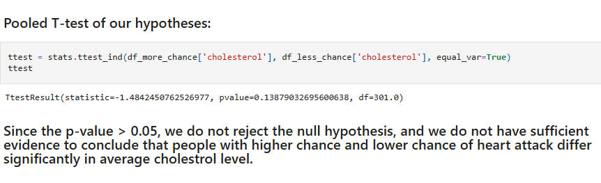 Hypothesis Test 1:Null: People with higher chance and lower chance of heart attack do not differ significantly in average cholesterol level.Alternative: People with higher chance and lower chance of heart attack differ significantly in average cholesterol level.(Note: We first performed the Shapiro Wilk Test for normality of the cholesterol feature and the Levene Test of the null hypothesis that the population variances are equal/homogenous.)