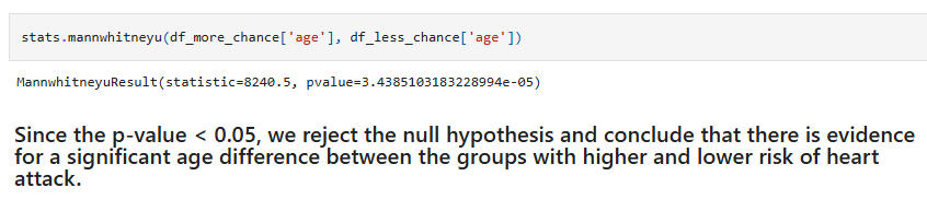 Hypothesis Test 2:Null: People with higher chance and lower chance of heart attack do not differ significantly in age.Alternative: People with higher chance and lower chance of heart attack differ significantly in age.(Again, Shapiro Wilk and Levene tests were performed. Due to the results of these, the Wilcoxon rank-sum test was used for the hypothesis test.)