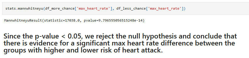 Hypothesis Test 3:Null: People with higher chance and lower chance of heart attack do not differ significantly in max heart rate.Alternative: People with higher chance and lower chance of heart attack differ significantly in max heart rate.(Again, the Wilcoxon rank-sum test was used for the hypothesis test.)