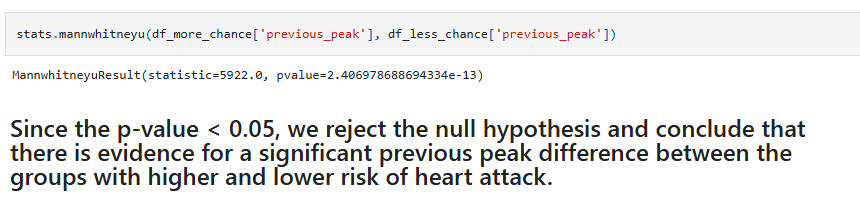 Hypothesis Test 4:Null: People with higher chance and lower chance of heart attack do not differ significantly in previous peak.Alternative: People with higher chance and lower chance of heart attack differ significantly in previous peak.(Again, the Wilcoxon rank-sum test was used for the hypothesis test.)