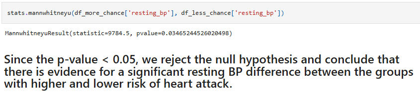 Hypothesis Test 5:Null: People with higher chance and lower chance of heart attack do not differ significantly in resting blood pressure.Alternative: People with higher chance and lower chance of heart attack differ significantly in resting blood pressure.(Again, the Wilcoxon rank-sum test was used for the hypothesis test.)