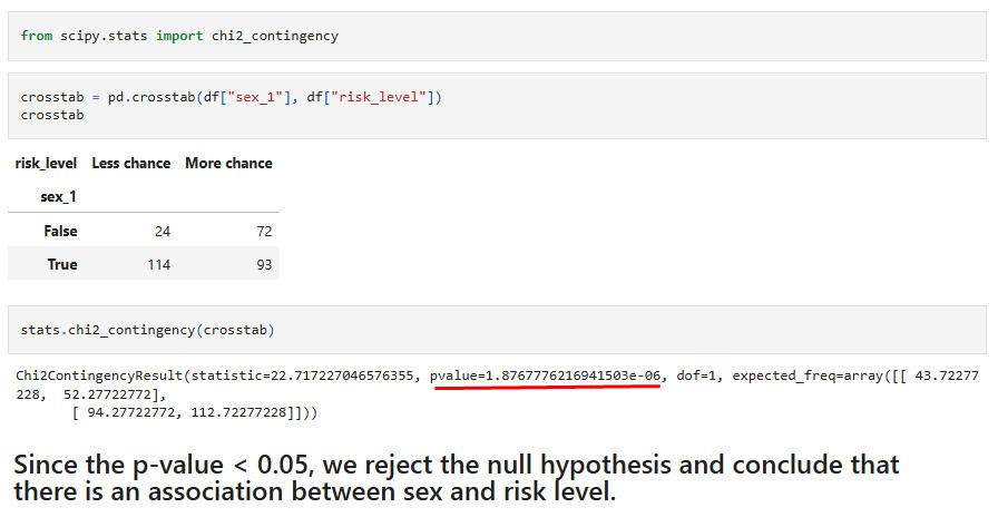 Hypothesis Test 6:Chi-Square test for association between the feature "sex" and the target "risk level."