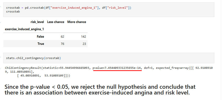 Hypothesis Test 7:Chi-Square test for association between the feature "exercise-induced angina" and the target "risk level."