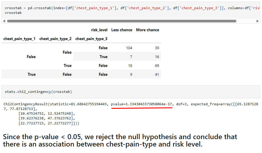 Hypothesis Test 10:Chi-Square test for association between the feature "chest-pain type" and the target "risk level."