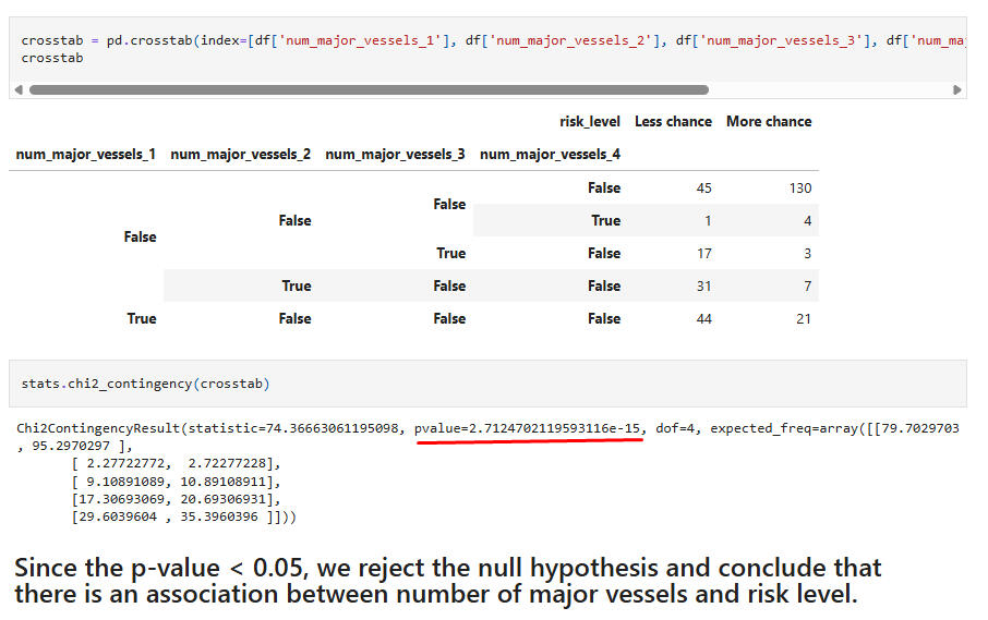 Hypothesis Test 11:Chi-Square test for association between the feature "number major vessels" and the target "risk level."